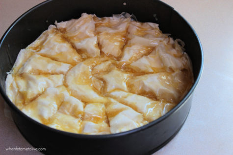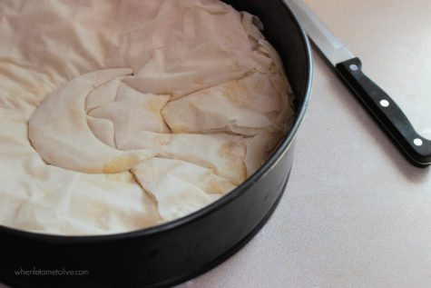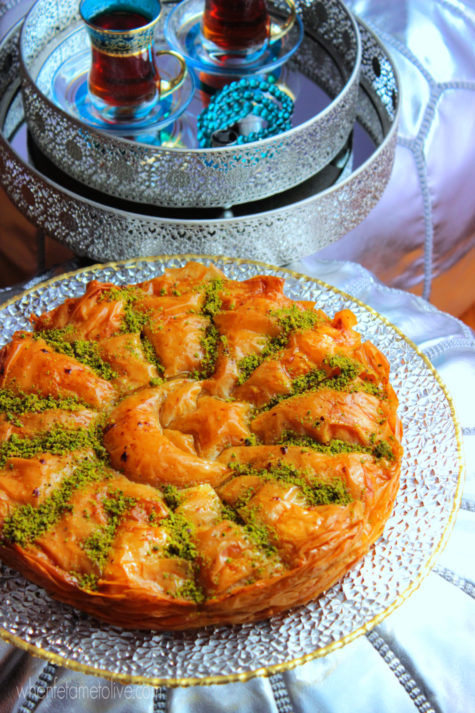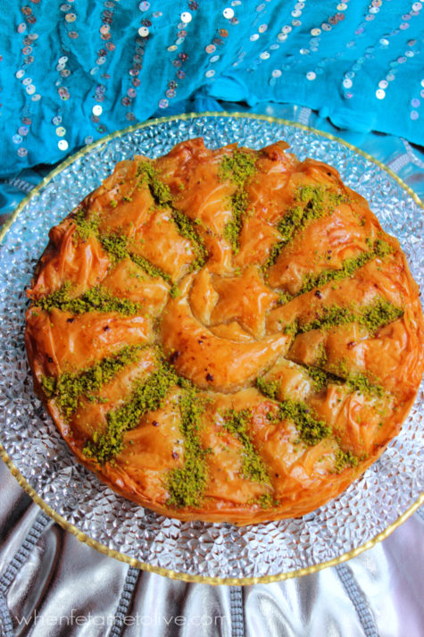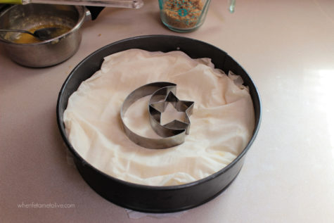 Use the cookie cutter in the centre of the baklava and then cut along like I did in the photo. I baked this in a spring form pan, but any 10 inch pan will do; the spring form pan makes it easy to remove and transfer to a serving platter.
